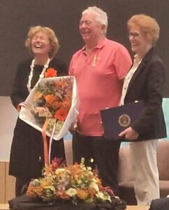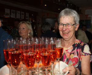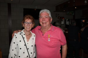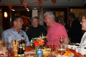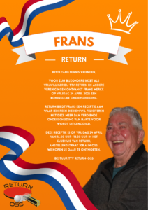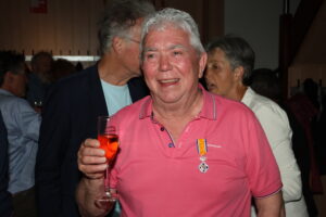 Het zal toch niet…..??? En ja wel hoor, Frans en Jeanne werden door de Osse burgemeester Froukje de Jonge op die vrijdagmorgen naar voren gehaald, voor het in ontvangst nemen van een koninklijke onderscheiding. Het heeft zijn hare majesteit de koning behaagd Frans Merkx te onderscheiden, vanwege zijn verdiensten, gedurende een groot aantal jaren in allerlei functies als vrijwilliger, bij sv TOP. Frans is bovendien lid van de technisch commissie en bestuurslid van de vereniging van eigenaren van het appartementen complex, waar hij samen met Jeanne woont. Maar ‘last but not least’ is hij bestuurslid en actieve vrijwilliger bij tafeltennisvereniging Return. Als bestuurslid is hij verantwoordelijk voor zowel de bar- als het accommodatie beheer. De inzet van Frans heeft er zeker toe bijgedragen dat TTV Return een zeer succesvolle en gezonde sportvereniging in Oss is. Tot hun grote verrassing had een feestcommissie van Return een surprise party -receptie -georganiseerd. Bij binnenkomst werd ‘het lang zal hij leven’ uit volle borst meegezongen. Heel wat leden hadden gehoor gegeven aan de uitnodiging, die vanwege de geheimhouding pas op het allerlaatste moment verzonden mocht worden. Het werd een bijzonder amicale happening in het sfeervolle sportcafé van de tafeltennisvereniging. Na de speech van voorzitter, Martijn Clevers werd er met glazen oranje bubbels geproost op de trotse bezitter van het ere metaal Een team van vrijwilligers zorgden voor hetuit serveren van de gevulde champagne glazen, de oranje soezen en wat later de feestelijke hapjes.